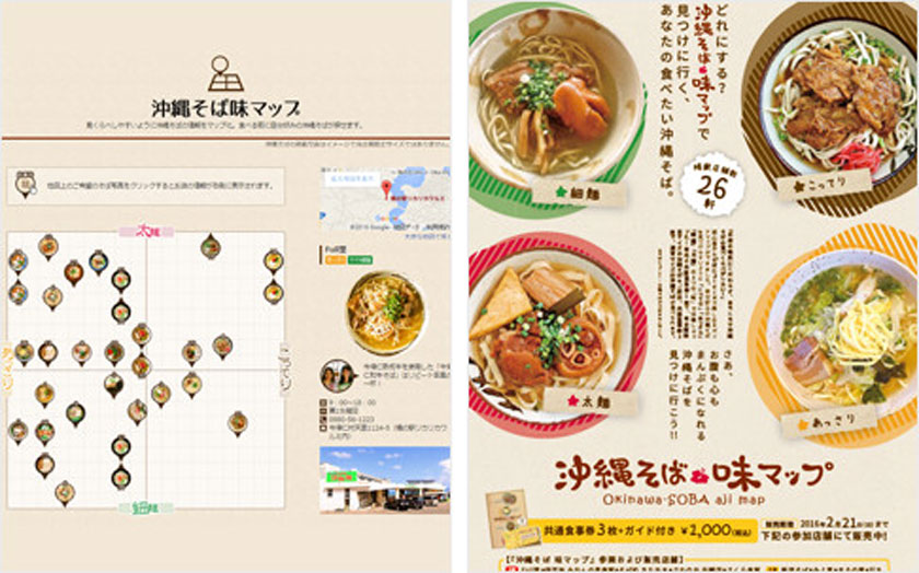 - 観光客が自分好みの沖縄そばを見つけやすいように、味を可視化したガイドマップを作成。